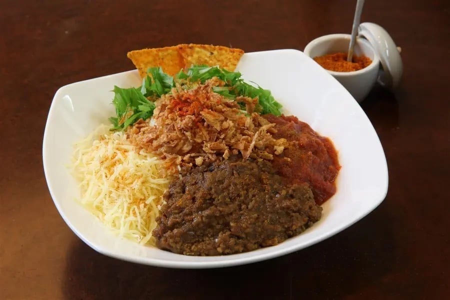 ずしかれーをベースにした辛めのキーマカレーにサルサソース、チーズ、みず菜、おんたまをトッピング。トルティーヤチップスも全て思いっきりかき混ぜてお召し上がりください。